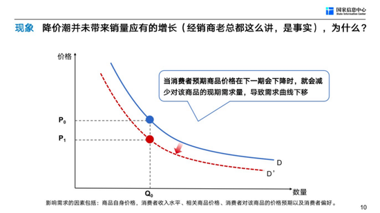还有其他很多因素,其中一个重要的就是心理预期,会影响需求曲线移动。如果大家认为下一期的价格和现在相比还要有大幅度的下降,他本期就不买,等到下期降价到位再说。今年的降价幅度太大了,在湖北市场,有的车从21万元降到12万元,那降3万元钱的车,客户觉得你价格没降到位。经销商说那几周,客流很多,但就是不出手,就等。消费者说你降2万元不行,人家湖北降了9万元,价格没到位,所以大家在等。这就是为什么今年那段时间,大幅度降价没有带来销售增长的解释。
