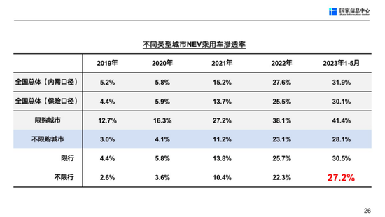 我们看27.2%这个数据,这个数据来自非限购也不限行的城市的NEV乘用车渗透率,在这样的城市里边,今年前五个月100个人买车有大概有27个人买新能源车型。去年平均是22.3%,今年1-5月提升了5个百分点左右,比全国提升的速度要快一点,这就意味着是消费者自愿购买,因为你可以自由选择买油车还是买电车。