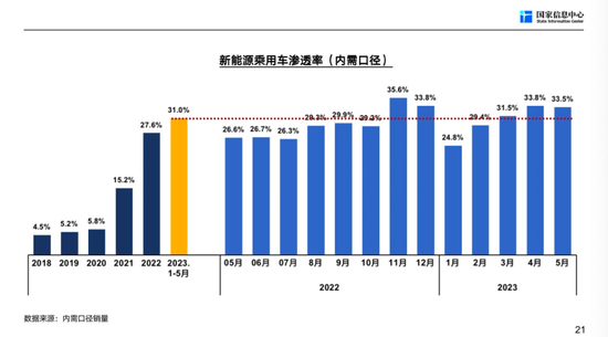 接下来跟大家分享一下新能源汽车市场的看法。过去两年半,我们叫跨越式发展。2021年新能源汽车销量增长约200万辆,达到326万辆,2022年增加约300万辆,达到了600多万辆,这是比较快的增长,增长速度2021年为156%,去年为91.3%,今年前五个月增长36.5%。从渗透率来讲,2021年涨了10个点左右,2022年涨了12个多点,今年前五个月涨了3个多百分点,达到31%,但4月份、5月份都达到了百分之三十三点几。