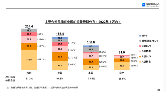 这些企业实力比较强大,具备降价的能力。进到他们的细分市场,他们必然会强力抵抗。大众,A级轿车销量占大众在中国总销量的49.1%,A级SUV占了16.7%,这两个合起来就是65.8%,占了三分之二,意味着三分之二是A级车。丰田少一点占了它自身的约54%,本田占了不到50%,日产是占了79.5%,接近80%。现在比亚迪秦和宋都是A级车,在从A油车分割市场。你想想电动车已经开始跟这些主流的A级车去竞争,主流合资企业一定会有动作的。